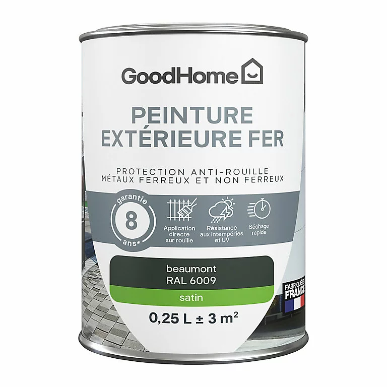 Peinture extérieure métal GoodHome Beaumont vert RAL 6009 satin 250ml