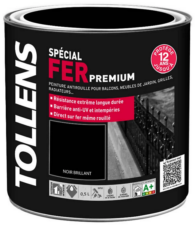 Redonnez un éclat à votre habitat! Cette peinture fer Tollens noir brillant 0,5L est conçue pour vos métaux ferreux : acier, fer, fonte et métaux non ferreux : zinc, cuivre, aluminium (après une préparation adaptée et selon consignes à respecter et restrictions d’usage).