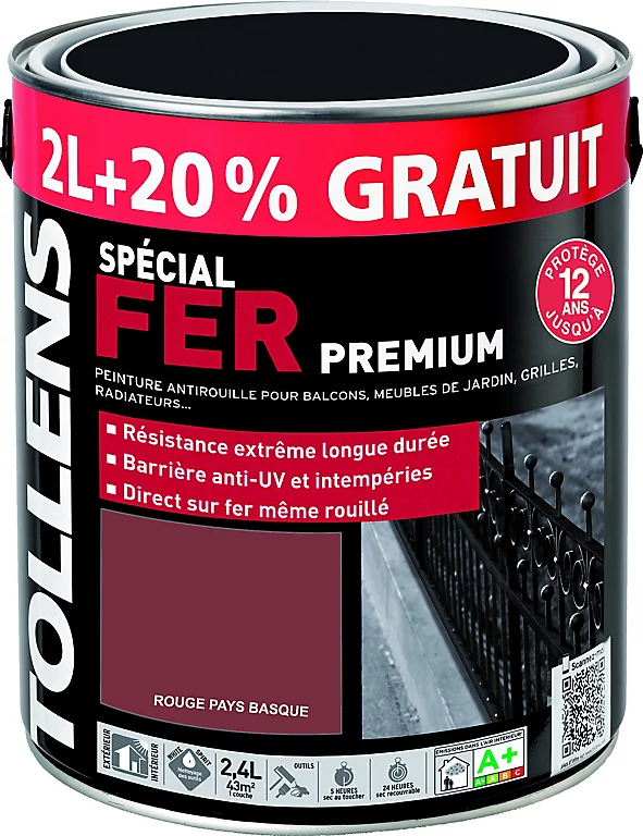 Redonnez un éclat à votre habitat! Cette peinture spéciale fer extérieur/intérieur Tollens rouge basque brillant 2L + 20% offert est conçue pour vos métaux ferreux : acier, fer, fonte et métaux non ferreux : zinc, cuivre, aluminium (après une préparation adaptée et selon consignes à respecter).