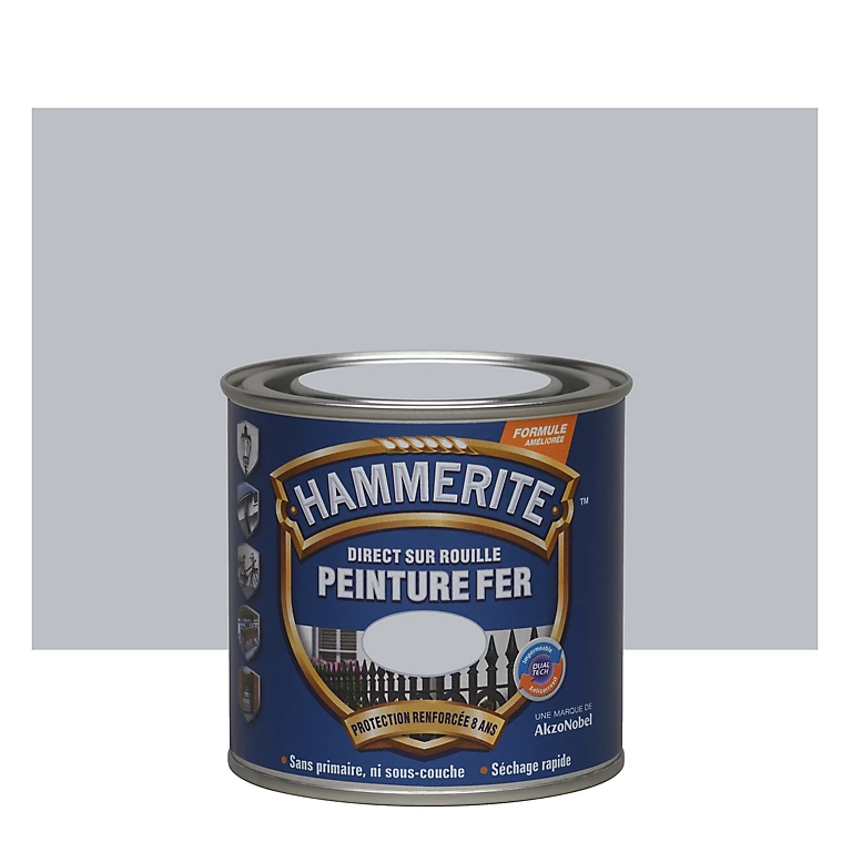 Avec son aspect martelé ,cette peinture s’applique direct sur rouille. Sans préparation excessive, elle est réputée comme un produit d’exception. Peinture esthétique antirouille, elle assure avec un seul et même produit la protection contre la corrosion pendant 8 ans. Idéal pour la décoration de métaux ferreux et non ferreux, du bois et de certains plastiques, sa formule gélifiée empêche les coulures. Hammerite sèche très rapidement et permet l’application de plusieurs couches en quelques heures au pinceau, au pistolet et au rouleau suivant des consignes à respecter.