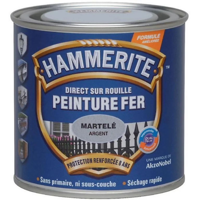 Avec son aspect martelé ,cette peinture s’applique direct sur rouille. Sans préparation excessive, elle est réputée comme un produit d’exception. Peinture esthétique antirouille, elle assure avec un seul et même produit la protection contre la corrosion pendant 8 ans. Idéal pour la décoration de métaux ferreux et non ferreux, du bois et de certains plastiques, sa formule gélifiée empêche les coulures. Hammerite sèche très rapidement et permet l’application de plusieurs couches en quelques heures au pinceau, au pistolet et au rouleau suivant des consignes à respecter.