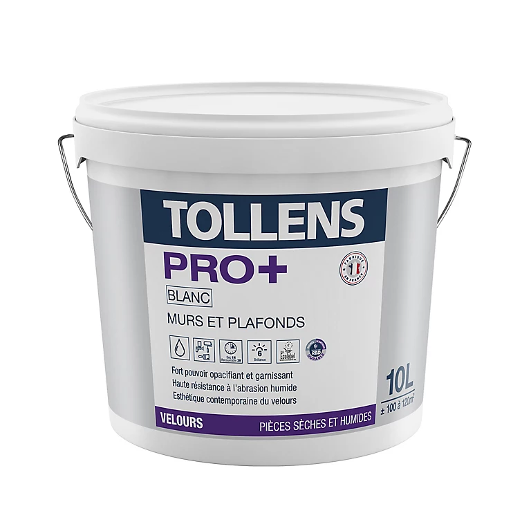 Peinture de qualité professionnelle pour mur et plafond aspect velours. Peinture acrylique en phase aqueuse, haut pouvoir opacifiant et garnissant. Bel aspect velours esthétique proche d’un mat et résistance proche d’un satin. Résistance aux lessivages, blancheur durable et velouté masquant les légers défauts du support. Excellent rendement, additif anti-rouille instantanée. Recouvrable dès 3H pour une réoccupation rapide des pièces Avant application, le support doit être sec, sain et propre. Appliquer une impression ou un primaire Tollens adapté.